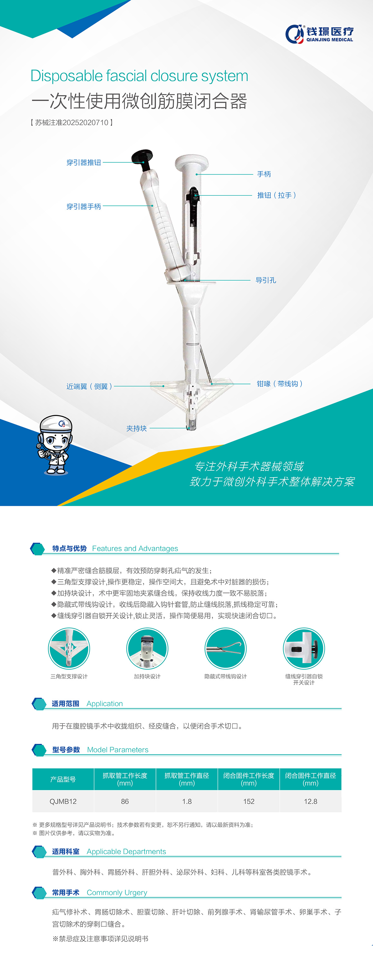 隱藏式帶線鉤設計,收線后隱藏入鉤針套管,防止縫線脫落,抓線穩定可靠;